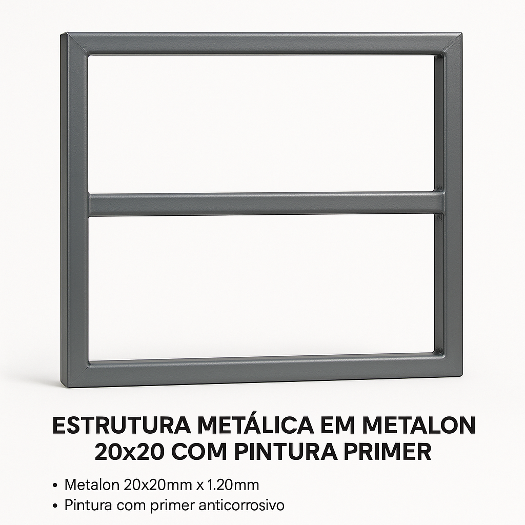 Especificação Técnica Material: Metalon 20x20mm espessura 1,20mm Acabamento: Pintura com primer anticorrosivo Fabricação: Solda MIG reforçada Reforço: Incluso automaticamente em estruturas acima de 2m Aplicação: Uso interno e externo Medidas: Fabricada em qualquer dimensão conforme projeto Fixação: Pronta para receber revestimento (ACM, lona, PVC, PS, etc.) Estrutura padrão entregue montada ou desmontada conforme necessidade Indicada para: Fachadas, placas, totens, painéis e displays estruturais